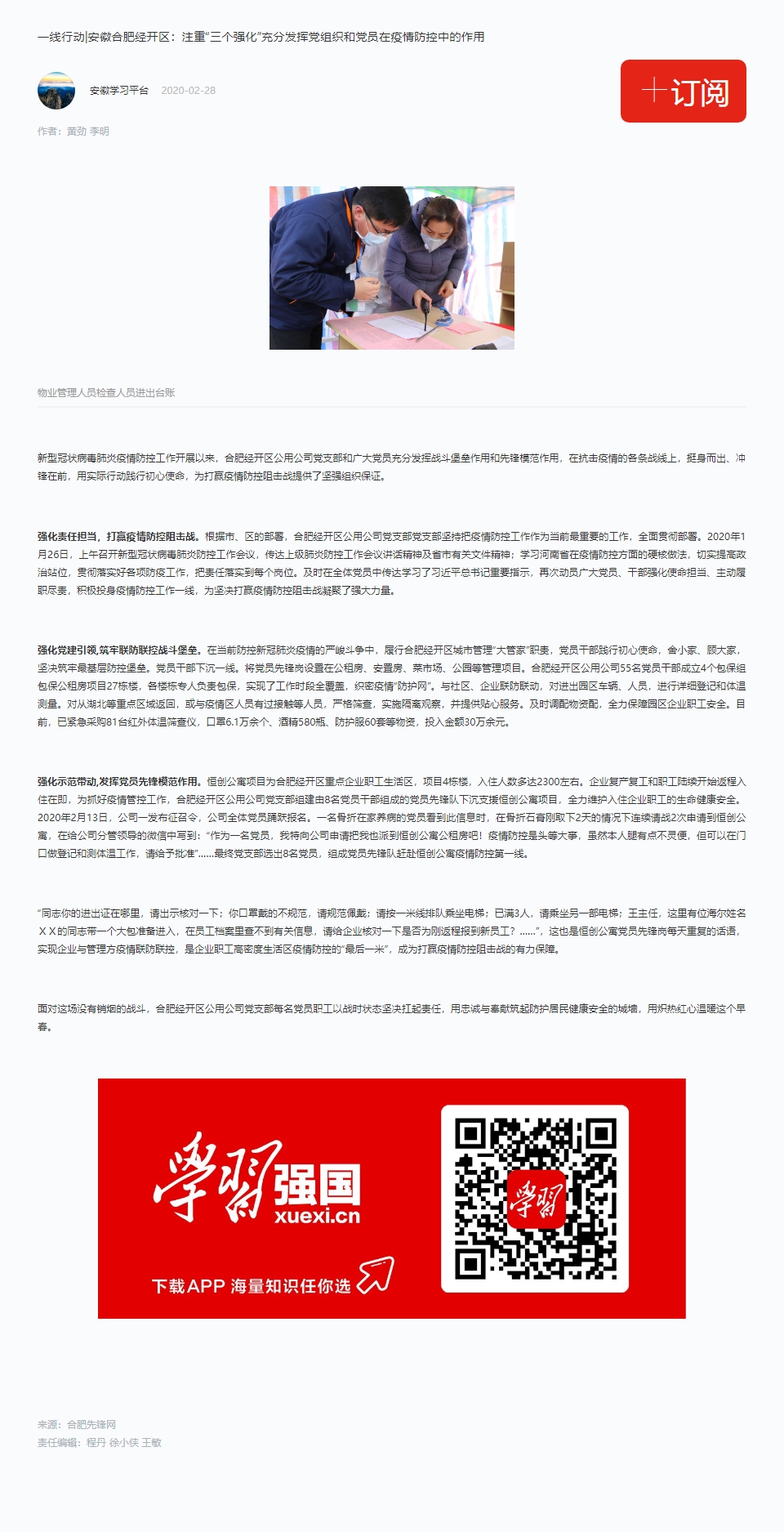 學習強國平臺:一線行動|安徽合肥經(jīng)開區(qū):注重“三個強化”充分發(fā)揮黨組織和黨員在疫情防控中的作用: