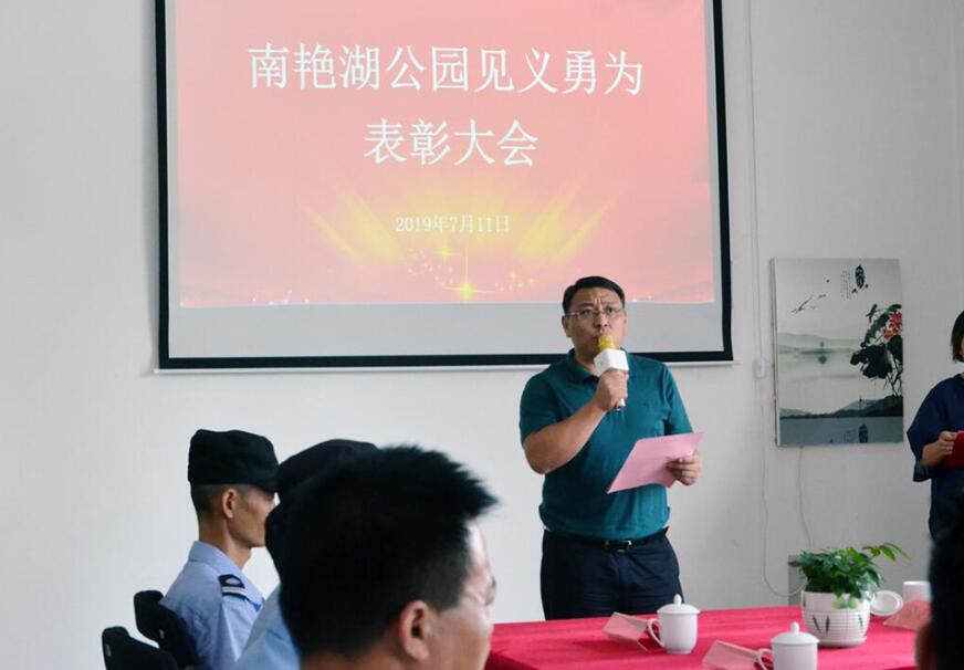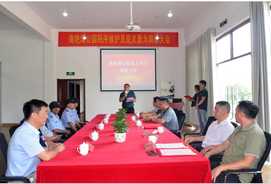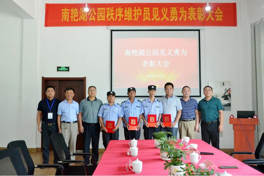7月11日下午,公用公司在南艷湖公園召開南艷湖公園秩序維護(hù)員見義勇為表彰大會(huì),為勇救南艷湖兩落水女孩的4名秩序維護(hù)員進(jìn)行表彰、頒獎(jiǎng)。區(qū)城管局局長趙志剛、副局長鐘俊明,公用公司總經(jīng)理李茂茂等出席會(huì)議。