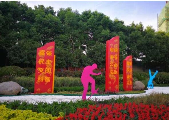 在松林路與石門路北側(cè)兩交口、百鳥路與石門路西側(cè)兩交口、繁華大道與天都路北側(cè)交口及翡翠公園東門花壇,共設立四處花境。本次花境使用植物品種達40種,嘗試使用百子蓮、金千層、斑葉芒、花葉絡石、雪茄花、金邊鳳尾蘭、鳶尾等花境植物新品種?!靶∑贰辈贾脟@全民健身、有趣和大愛的氛圍,擺放單車、運動造型、可愛兔等剪影。