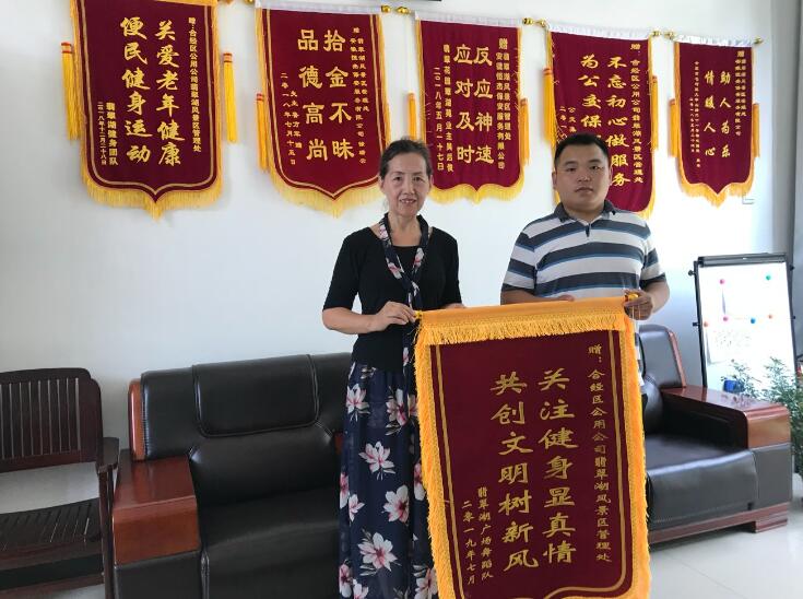 7月23日上午,經(jīng)開區(qū)翡翠花園小區(qū)廣場舞領(lǐng)隊常女士將一面寫有“關(guān)注健身顯真情,共創(chuàng)文明樹新風”的錦旗送至翡翠湖風景區(qū)管理處,并連聲感謝:“你們的工作太周到了,想我們所想,我們翡翠湖廣場舞蹈隊全體隊員向你們表示感謝!”這是從2018年1月1日接管以來,翡翠湖風景區(qū)管理處收到市民贈送的第6面錦旗!