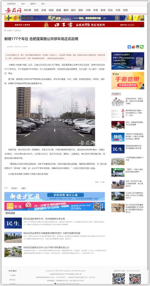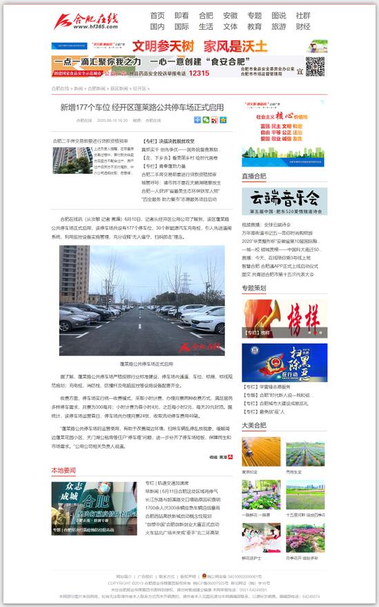 安徽網(wǎng):新增177個車位,經(jīng)開區(qū)蓬萊路停車場正式啟用:http://www.ahwang.cn/hefei/20200610/2084061.html
