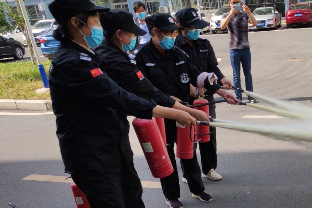 隨后,教官組織相關人員進行火災疏散演練,模擬小區(qū)樓道失火后的人員逃生救援與火情控制。演練現(xiàn)場,濃煙彌漫樓道。保安人員趕赴現(xiàn)場,拉起警戒線,使用滅火器對火情進行控制。隨后消防車趕到現(xiàn)場,撲滅明火。保安人員進入樓道,組織人員疏散撤離,順利完成此次消防安全應急疏散演練。
