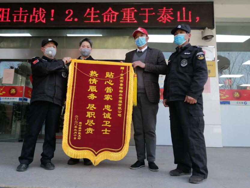 3月17日下午,中國(guó)建設(shè)銀行合肥經(jīng)開(kāi)區(qū)支行派代表將一面印有“熱情服務(wù)、盡職盡責(zé)、貼心管家、忠誠(chéng)衛(wèi)士”送到明珠廣場(chǎng)物業(yè)管理處辦公室,對(duì)香怡物業(yè)在防疫工作中的盡職盡責(zé)表示感謝,并對(duì)陸士先等三名保安人員的熱情服務(wù),認(rèn)真負(fù)責(zé),任勞任怨的工作態(tài)度給予贊賞。