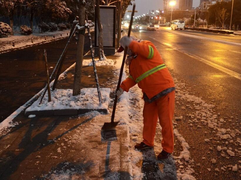 在我區(qū)紫云路和始信路的人行天橋上,3名環(huán)衛(wèi)工人帶著手套,手持鐵鍬,分組對人行天橋橋面進(jìn)行鏟雪除冰作業(yè)。為了防止氣溫過低,橋面水漬結(jié)冰環(huán)衛(wèi)工人還在人行天橋鋪上了防滑墊和警示錐,并在結(jié)冰較為嚴(yán)重的橋面適量潑灑融雪劑;在天門湖公租房,物業(yè)管理處一方面正冒著風(fēng)雪對過往車輛、人員進(jìn)行登記和體溫檢測,另一方面投入人員鋪設(shè)防滑墊、潑灑融雪劑,開展鏟雪除冰作業(yè),保障公租房內(nèi)部道路通暢;在紫云花園小區(qū),針對疫情防控期間小區(qū)少量居民翻越圍墻進(jìn)出的現(xiàn)象,物業(yè)管理處在完成了鏟雪除冰作業(yè)后,還冒雪使用200余米刺絲對小區(qū)圍擋缺口進(jìn)行封閉,并裝訂了5塊安全提示牌……