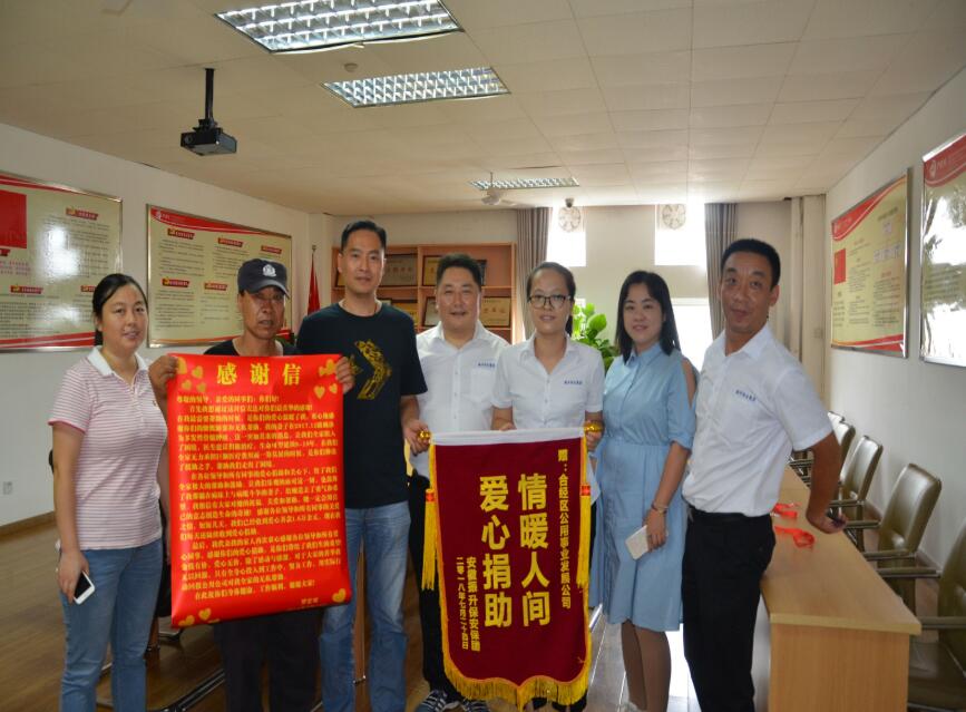 2018年7月20日,在公用公司領(lǐng)導(dǎo)關(guān)心和倡儀下以及物業(yè)部愛心組織下,公司發(fā)起了為振升保安公司駐佛掌路廠房項(xiàng)目部保安隊(duì)長羅宏雙同志的妻子的愛心捐助活動。經(jīng)過2天的募捐,共收到愛心捐款1.6萬元。7月25日,安徽振升保安集團(tuán)公司及羅宏雙個(gè)人就公用公司愛心捐助活動送錦旗與感謝信,表達(dá)對公司全體工作人員的感謝之情。