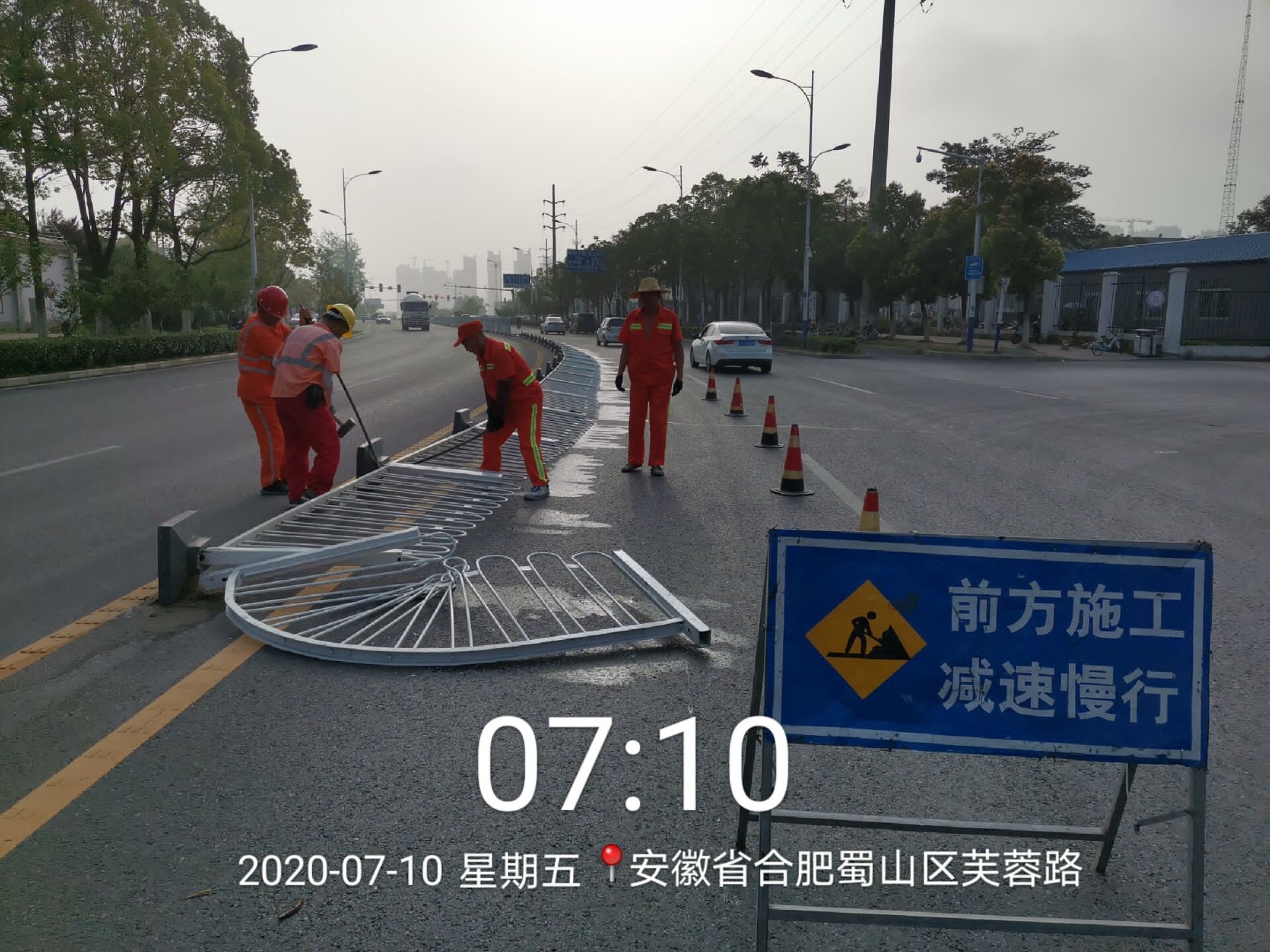 7月10日上午,公用公司市政養(yǎng)護(hù)人員巡查時(shí)發(fā)現(xiàn)經(jīng)開(kāi)區(qū)芙蓉路海爾工業(yè)園北門路口百余米長(zhǎng)的道路中央分隔護(hù)欄被車輛撞倒,橫臥在道路一側(cè)。由于該處地點(diǎn)位于合肥創(chuàng)新創(chuàng)業(yè)園區(qū)附近,上班早高峰即將臨近,在發(fā)現(xiàn)市政護(hù)欄傾倒的第一時(shí)間,養(yǎng)護(hù)人員迅速進(jìn)行扶正,在早高峰來(lái)臨前即消除交通出行安全隱患。