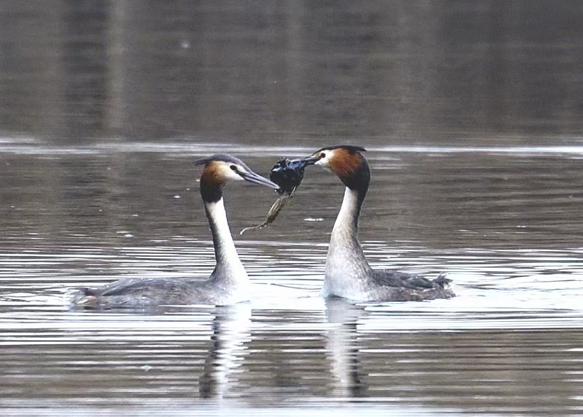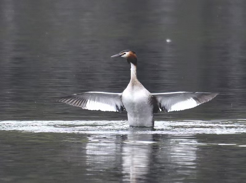 注:鳳頭鸊鷉(學(xué)名:Podicepscristatus):體長為50厘米以上,體重為0.5-1千克。前額和頭頂部黑褐色,枕部兩側(cè)的羽毛往后延伸,分別形成束羽冠。腳的位置幾乎處于身體末端,尾羽短而不顯,趾側(cè)有瓣蹼。瓣蹼十分發(fā)達(dá),除了適于游水之外,在陸地上幾乎是寸步難移的。成對(duì)或集成小群活動(dòng)在既是開闊水面又長有蘆葦水草的湖泊中,極善水性,建造浮巢,建筑材料是水生植物的葉子,能隨同水位上漲而漂起,吃昆蟲、昆蟲幼蟲、蝦、喇咕、甲殼類、軟體動(dòng)物等水生無脊椎動(dòng)物,偶爾也吃少量水生植物。廣泛分布于歐洲、亞洲、非洲、大洋洲。