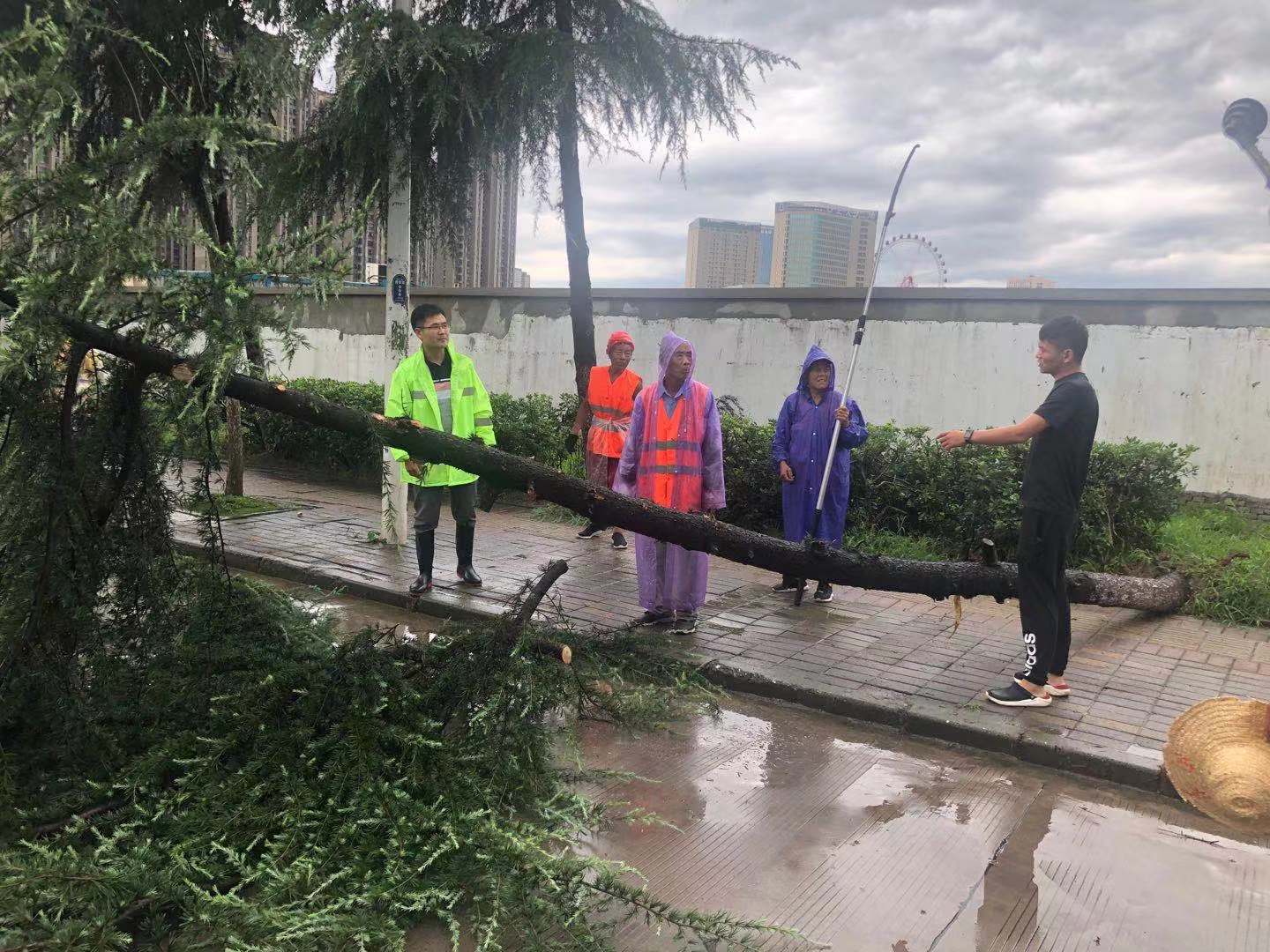 在青龍?zhí)堵废麓┓脚d大道橋值守點(diǎn)處,幾名市政處工作人員正在現(xiàn)場(chǎng)巡查積水情況,密切關(guān)注雨情汛情,并設(shè)置醒目提醒標(biāo)識(shí),保障交通順暢。在天都路、佛掌路等處,綠環(huán)處工作人員正在緊急處置樹(shù)木傾斜、倒伏情況,及時(shí)排除安全隱患,確保道路交通安全。同時(shí),排水管理中心依據(jù)雨情預(yù)警提前布置應(yīng)急排水相關(guān)工作,降雨過(guò)程中對(duì)管網(wǎng)加大排查力度,及時(shí)清理大雨沖積產(chǎn)生的淤泥等雜物,保障排水暢通。