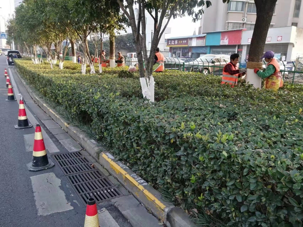 刷白是秋冬季城市綠化養(yǎng)護(hù)不可或缺的一項工作,既避免樹木凍傷及日灼,又能防止病菌侵染和蟲害,同時也使冬季道路更加整潔美觀。為保障刷白效果,市政管理中心制定統(tǒng)一的標(biāo)準(zhǔn),要求養(yǎng)護(hù)單位科學(xué)配制刷白劑,同路段、區(qū)域刷白高度保持一致,確保刷白規(guī)范、有效。在集中刷白的基礎(chǔ)上,中心同時還對香樟等耐寒性較差的常綠喬木進(jìn)行了裹干,用草繩嚴(yán)密包裹刷白后的主干,提高其耐寒性,預(yù)防低溫凍害。