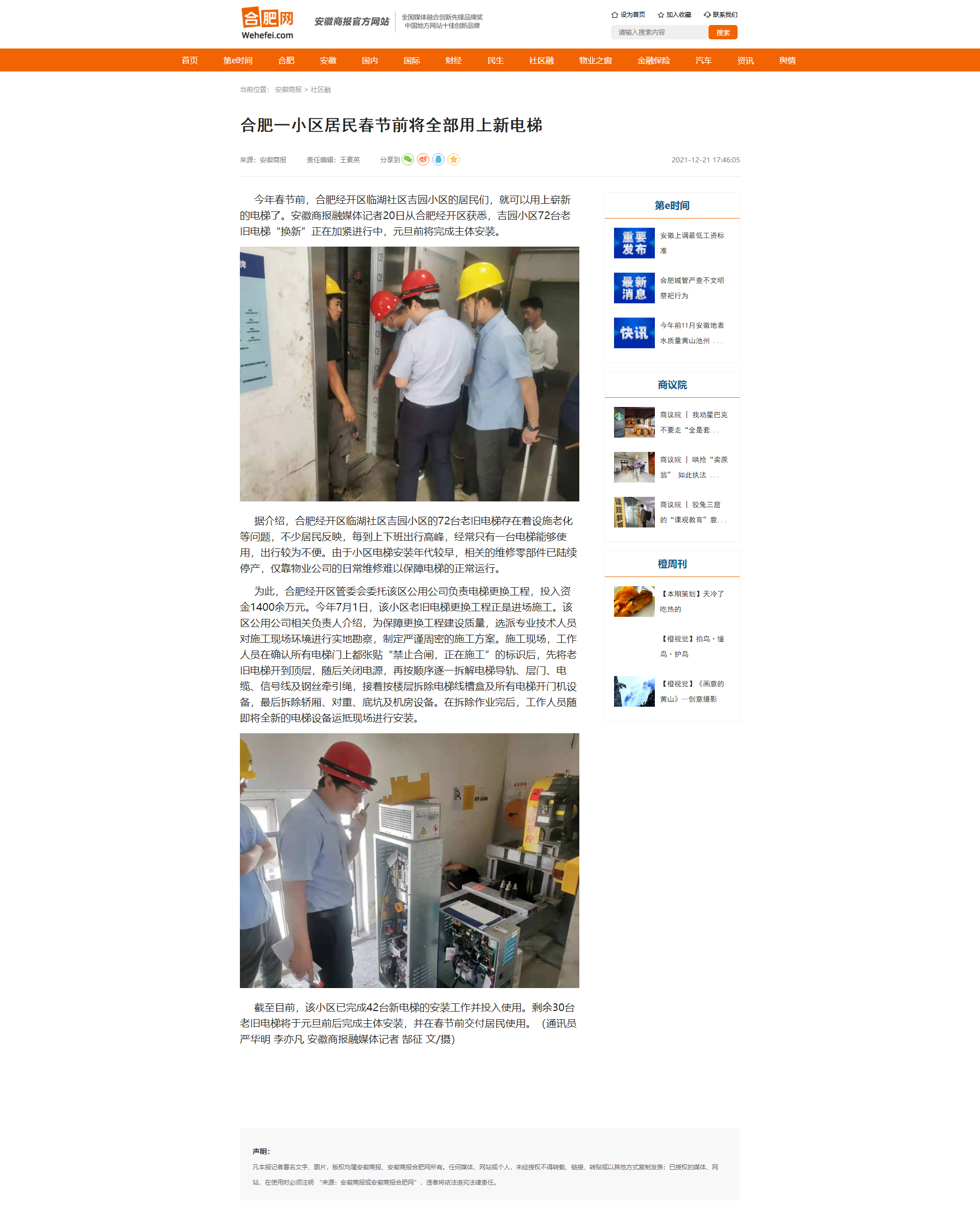 安徽商報(bào):合肥一小區(qū)居民春節(jié)前將全部用上新電梯http://www.wehefei.com/news/2021/12/21/c_390516.htm