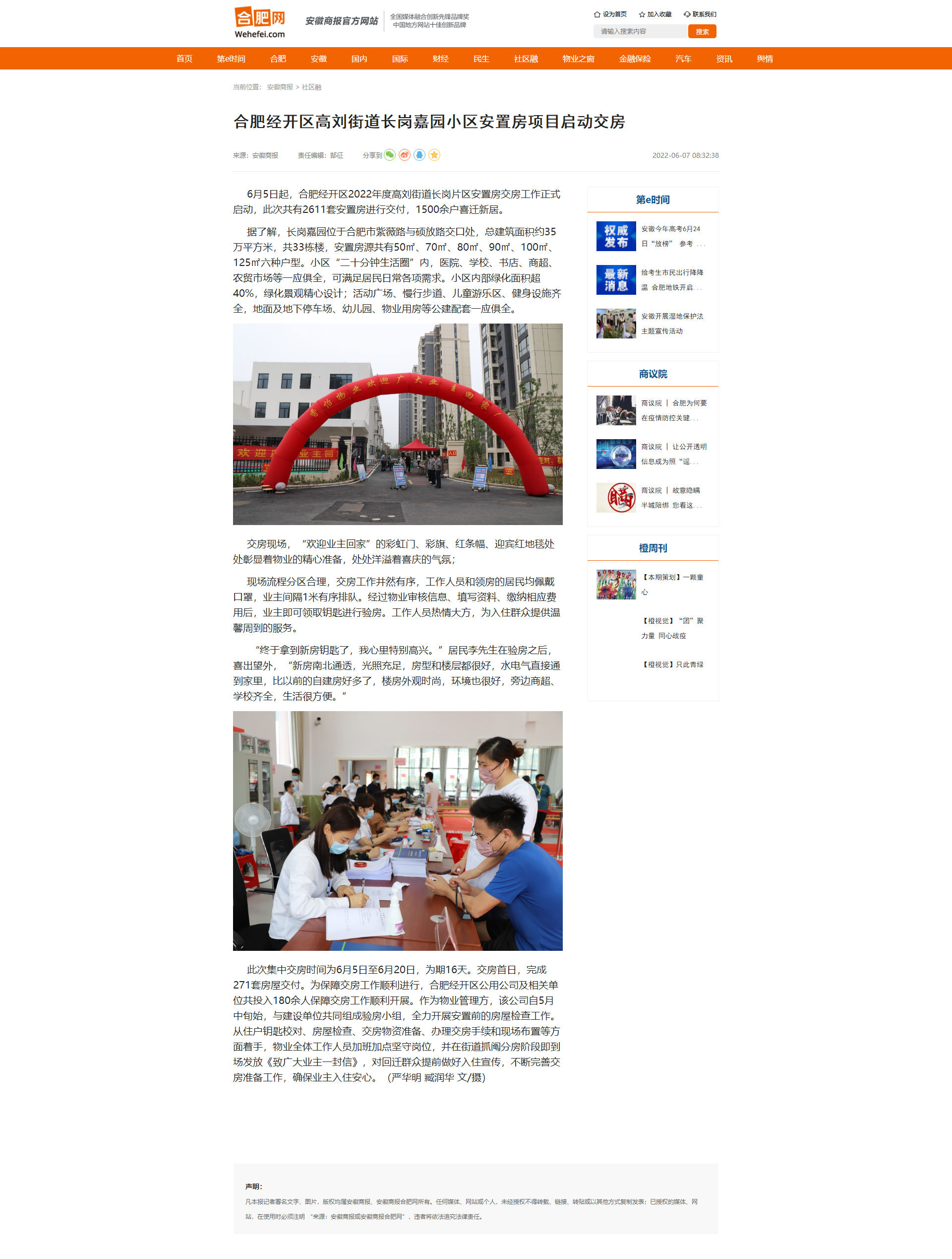 安徽商報:合肥經(jīng)開區(qū)高劉街道長崗嘉園小區(qū)安置房項目啟動交房http://www.wehefei.com/news/2022/06/07/c_431349.htm。