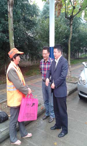 2012年10月26日為合肥市的第十七個“環(huán)衛(wèi)工人節(jié)”,在“環(huán)衛(wèi)節(jié)”當天上午,公用公司總經(jīng)理付海斌、副總經(jīng)理衛(wèi)愛麟在管養(yǎng)部部長及工作人員的陪同下,對“環(huán)衛(wèi)節(jié)”仍然戰(zhàn)斗在道路保潔崗位的保潔員送去了節(jié)日的問候,并給部分家庭困難的保潔員送去了慰問品,以感謝他們?yōu)槌鞘协h(huán)衛(wèi)工作所做出的貢獻。(管養(yǎng)部供稿)