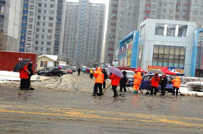 根據(jù)天氣預(yù)報(bào)情況,公司提前做好工業(yè)鹽、融雪劑、鏟雪車(chē)輛、鐵鍬等物質(zhì)儲(chǔ)備,17日晚上,由分管領(lǐng)導(dǎo)帶班,管養(yǎng)部、物業(yè)部、各物業(yè)點(diǎn)全部安排24小時(shí)值班,嚴(yán)防死守。18日凌晨4點(diǎn)多,鏟雪除冰人員已全部到位。