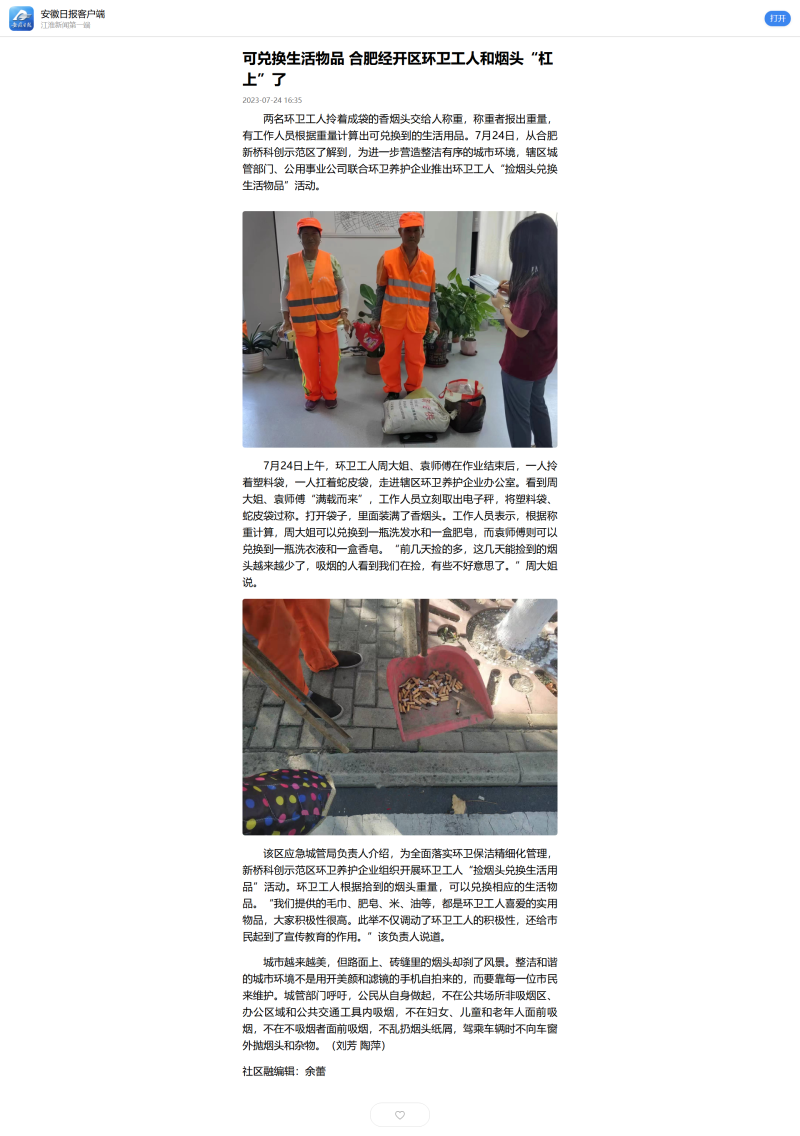 安徽日報:可兌換生活物品 合肥經(jīng)開區(qū)環(huán)衛(wèi)工人和煙頭“杠上”了https://app.ahnews.com.cn/displayTemplate/news/newsDetail/1547/901210.html?isShare=true