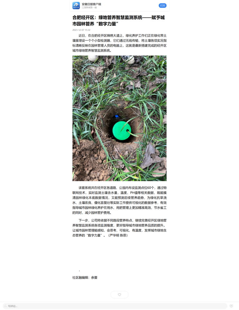 安徽日報:合肥經(jīng)開區(qū):綠地管養(yǎng)智慧監(jiān)測系統(tǒng),賦予城市園林管養(yǎng)數(shù)字力量