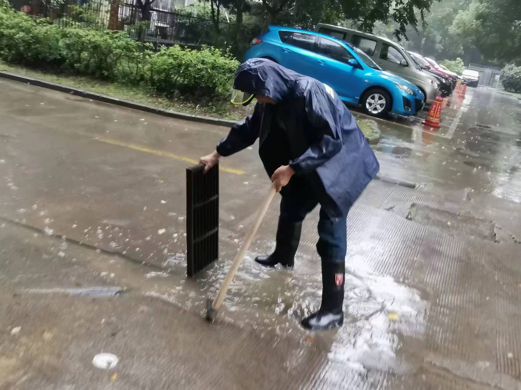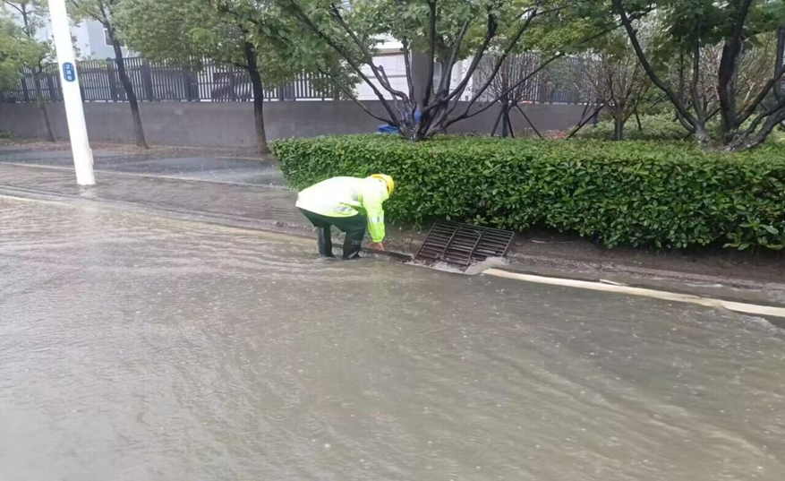 7月11日上午,物業(yè)管理中心工作人員正在處理芙蓉公寓小區(qū)路面積水。