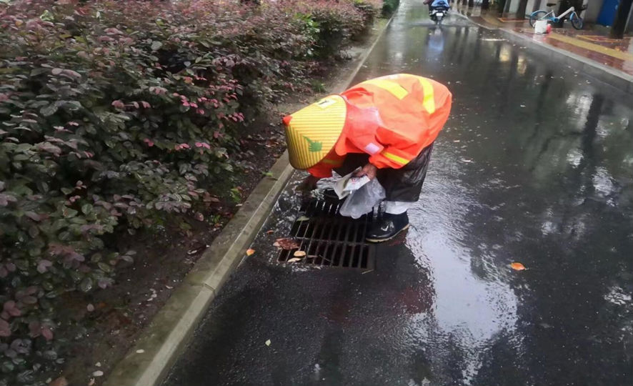 7月11日上午,綠環(huán)管理中心工作人員正在清理紫蓬路收水口周邊垃圾。