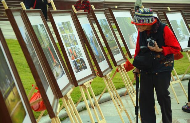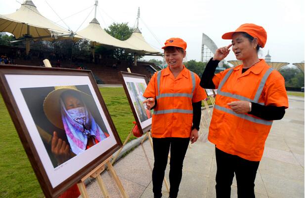 環(huán)衛(wèi)工人饒有興趣的欣賞攝影大賽的優(yōu)秀作品