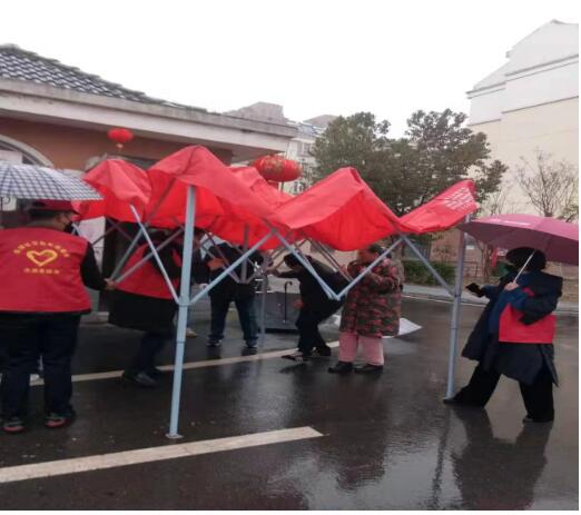 臥云新村 春寒料峭,細雨紛紛,居民王森亮捐出自家經(jīng)營的紅棚子,黃保珍捐出紅雨傘,還有熱心市民紛紛捐來雨傘,支持疫情防護工作。
