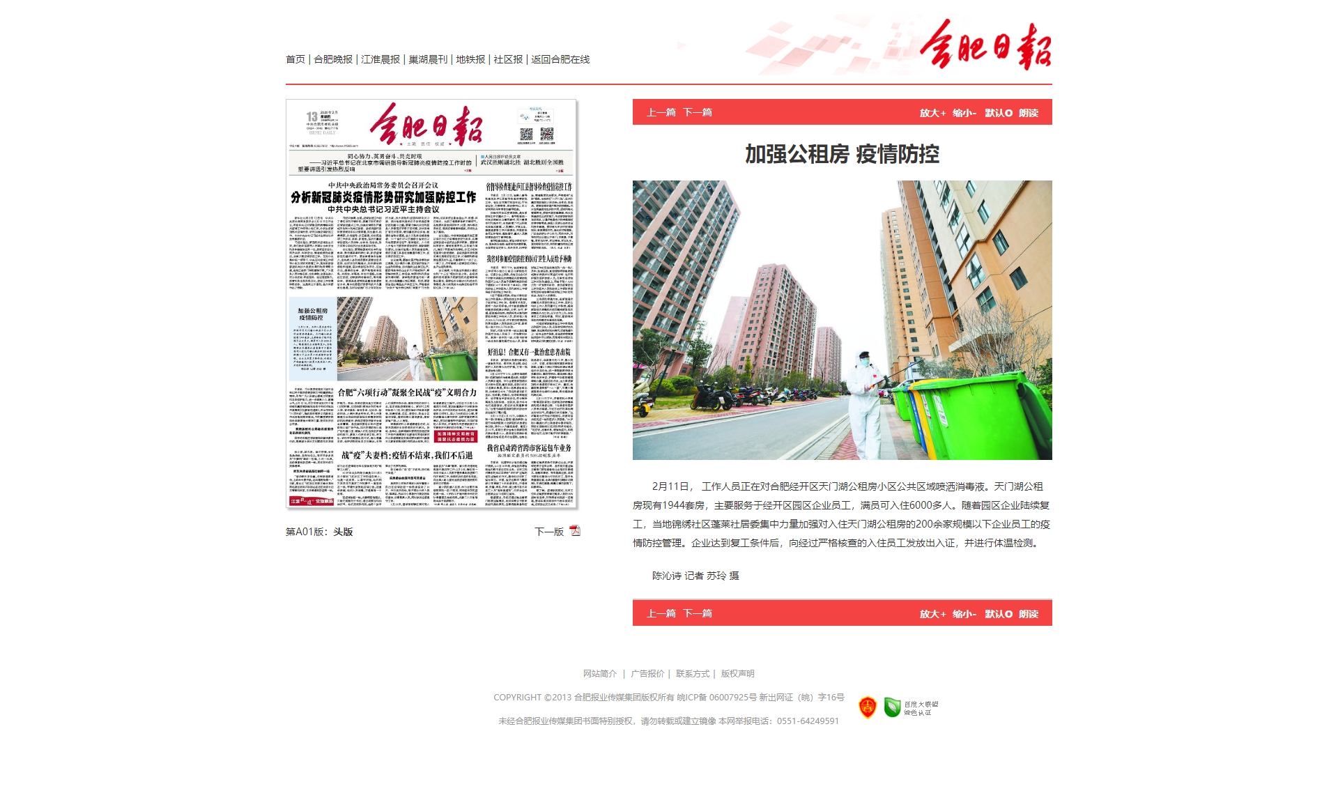 合肥日報:加強公租房 疫情防控http://newspaper.hf365.com/hfrb/pc/content/202002/13/content_146033.html