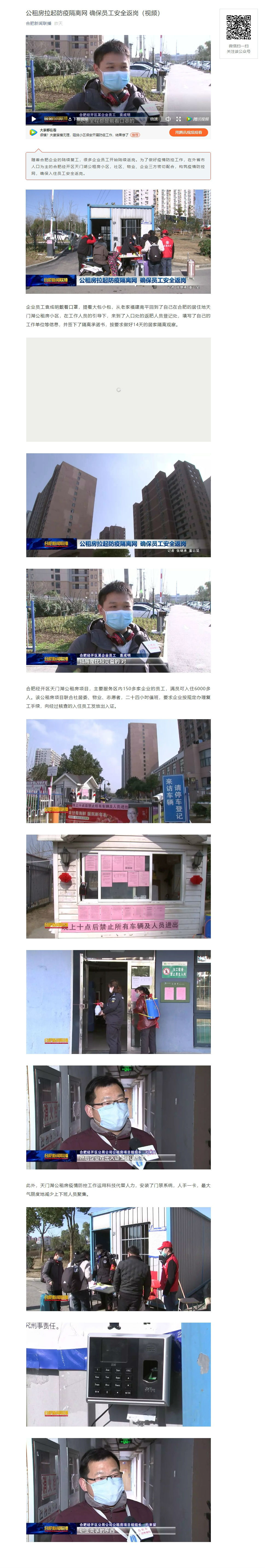 合肥新聞聯(lián)播:公租房拉起防疫隔離網(wǎng) 確保員工安全返崗(視頻):https://mp.weixin.qq.com/s?__biz=MzUyOTExNjYxMg==&mid=2247606734&idx=8&sn=0c0c3ffdbd657c0a9b379fb3d838fd31&chksm=fa669d65cd11147354f97d11ed89592c7f66ae0334369ad64c87bc87c7de483e309fe19c1749&mpshare=1&scene=23&srcid=&sharer_sharetime=1582115178836&sharer_shareid=3cbba8f2105809d0ef064b44f8beafe7#rd