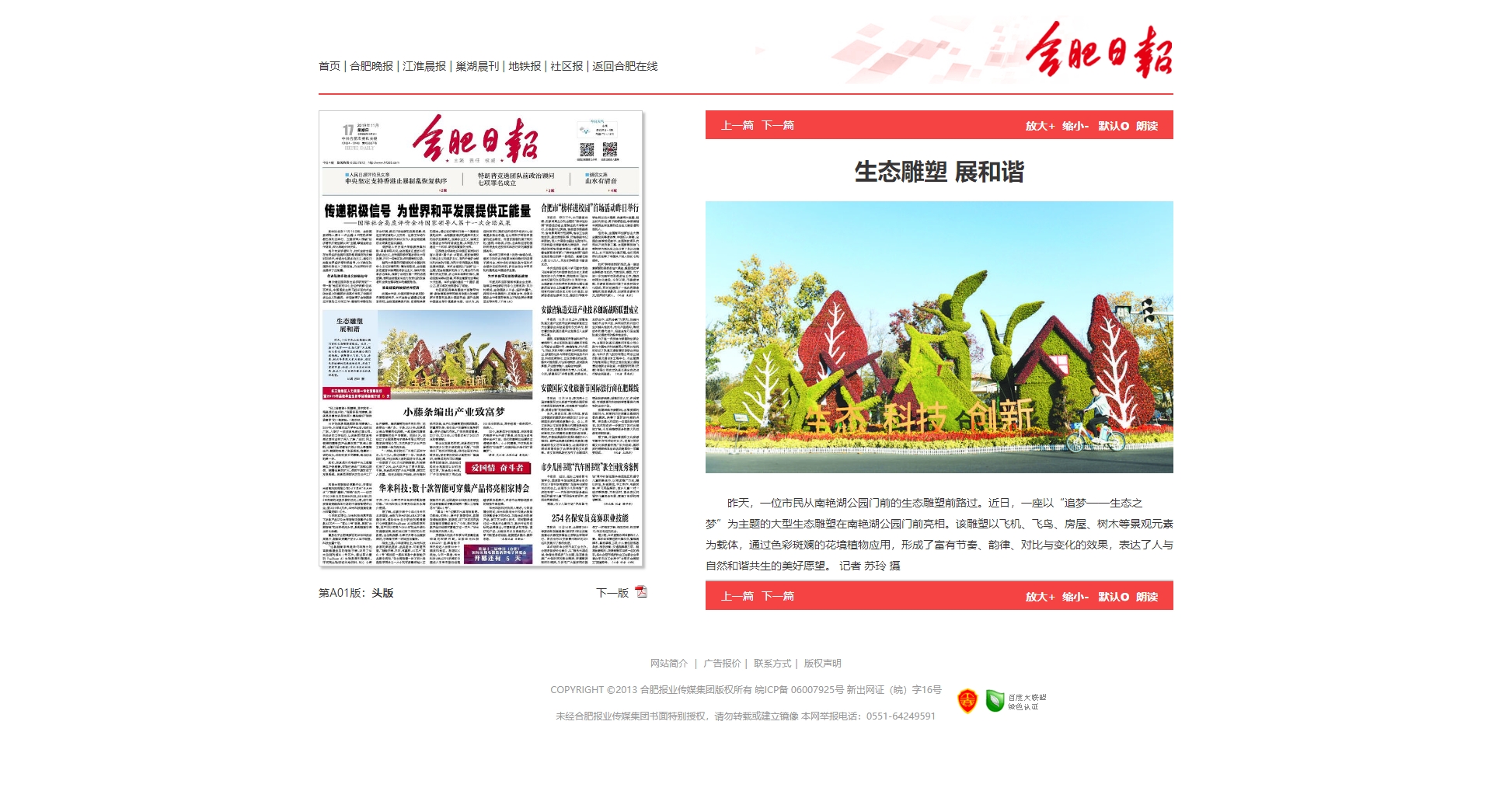 合肥日?qǐng)?bào)11月17日頭版:生態(tài)雕塑 展和諧:http://newspaper.hf365.com/hfrb/pc/content/201911/17/content_125067.html