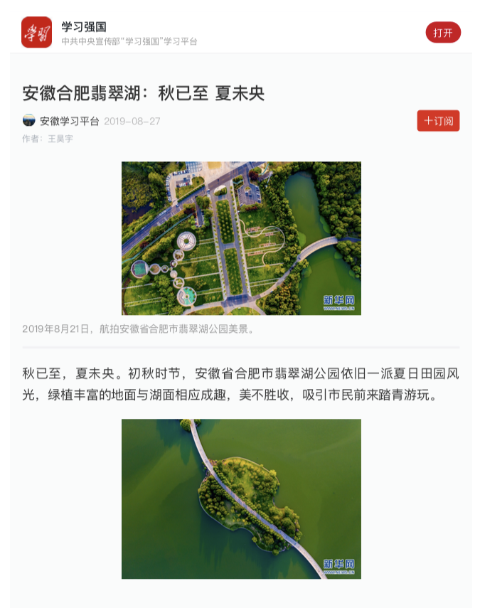 學習強國:安徽合肥翡翠湖:秋已至 夏未央:https://article.xuexi.cn/articles/index.html?art_id=2523320341353395226&study_style_id=feeds_default&source=share&share_to=wx_single&from=timeline&isappinstalled=0