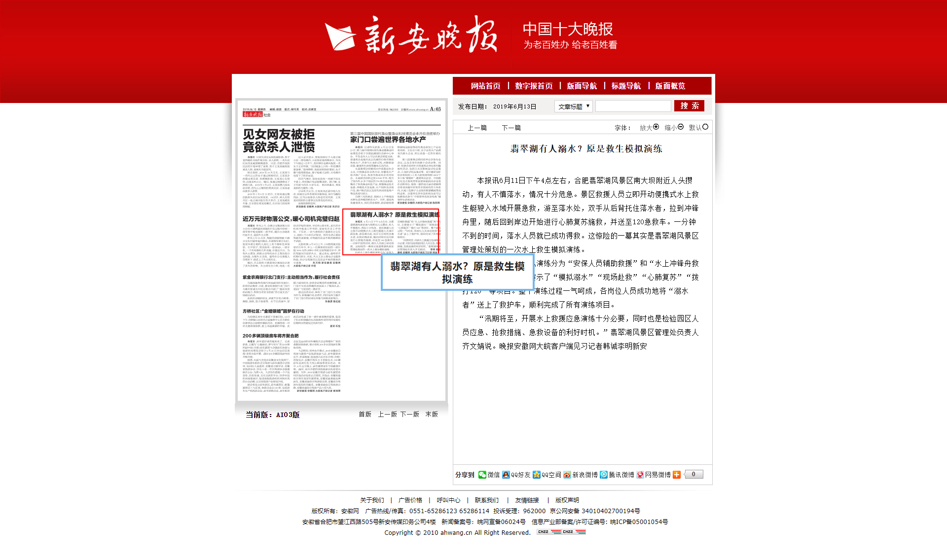 新安晚報(bào)6月13日第三版:翡翠湖有人溺水?原是救生模擬演練