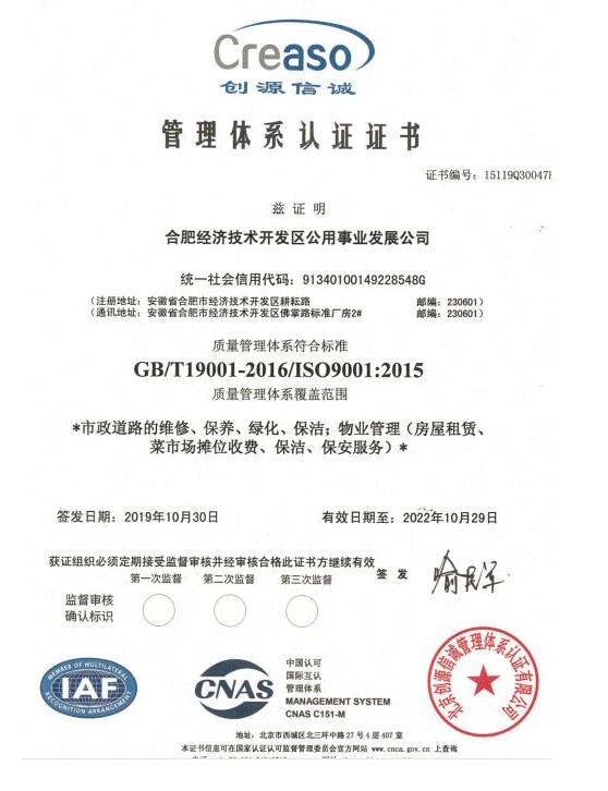 經(jīng)過(guò)公司上下為期半年多的努力,2019年11月8日,公用公司獲得北京創(chuàng)源信誠(chéng)管理體系認(rèn)證有限公司頒發(fā)的ISO9001質(zhì)量管理體系證書,標(biāo)志著公司在管理的科學(xué)化、制度化、標(biāo)準(zhǔn)化、規(guī)范化方面邁上新臺(tái)階。